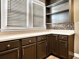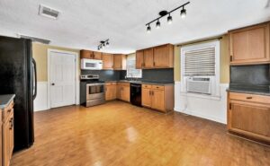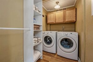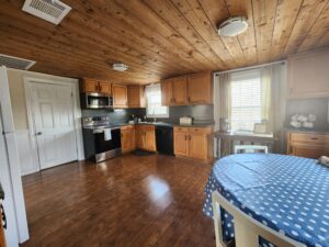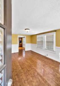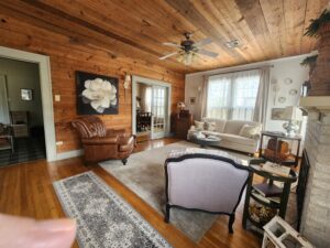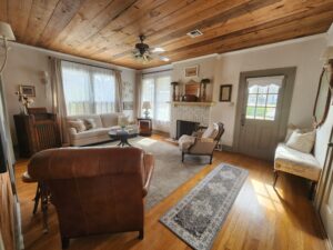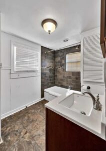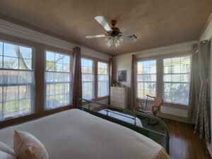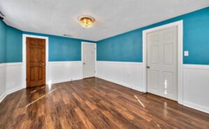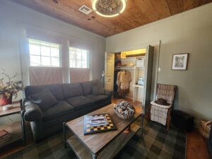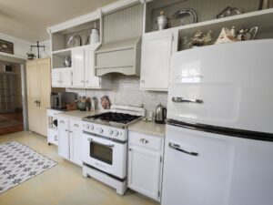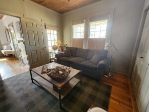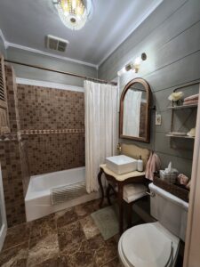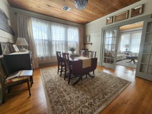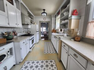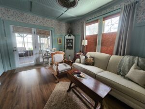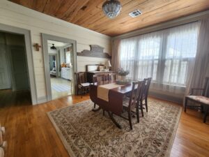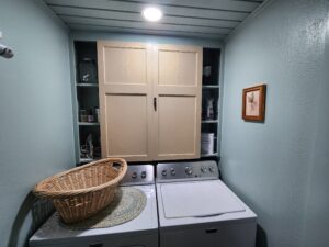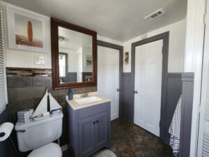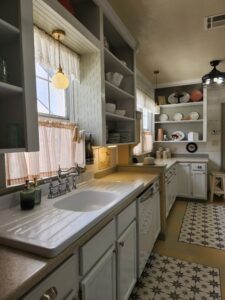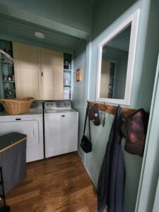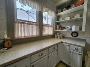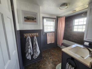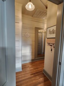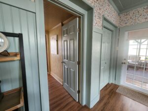 Found vintage-inspired wallpaper for the backroom and beadboard for the walls, and paint to match the ceiling and doors. I’m really embracing the color-wash look. Tony installed the wallpaper and said he’ll never install wallpaper again. We moved the kitchen entrance early on and obviously removed the bathroom door. We did put a door in the hallway. By doing so, it does give the primary bedroom the feel of a suite.