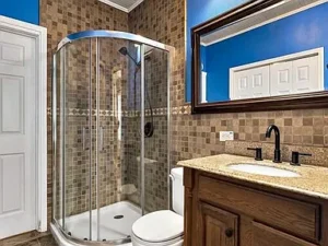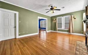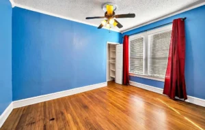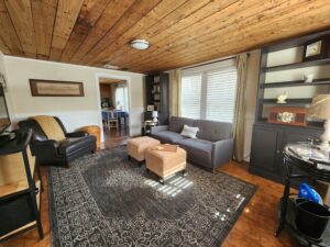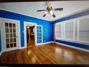 The backroom where we spend most of our time. This is the room that we had started with, the ceiling of which was damaged by the storm. We also had to deal with our awkward bathroom that led to our primary bedroom. We actually had to go through it to get to our room. We converted the bathroom closet into a hallway. We were able to make the closet in our room much bigger by using space from the bathroom. It makes sense in the pictures. I also color-washed both the bathroom and the hallway.