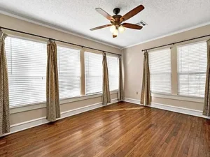 The front bedroom/den has not been covered in the previous post. It was one of the last projects we did. Refigured the closet and trimmed it in with the matching door trim throughout the house. I color-washed the room and installed new window shades.
